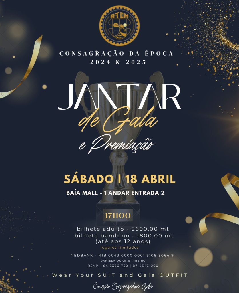 Começou a contagem regressiva para a realização da Consagração da época desportiva 2024 e 2025 do Automóvel e Touring Clube de Moçambique ( ATCM ) membro da FIA. A Consagração da época desportiva 2024 e 2025 vai culminar com a realização do Jantar de Gala de Premiação no Sábado 18 de Abril às 17H00 no Baia Mall em Maputo. No Jantar de Gala de Premiação, estarão em destaque os Pilotos e as equipas que se notabilizaram nas duas (2) temporadas em referência nas modalidades de Automobilismo movimentadas com sucesso pelo ATCM. Entretanto, a Consagração da época desportiva, simboliza o momento mais alto e nobre do encerramento de uma etapa no desporto motorizado, onde são premiados todos os Pilotos e equipas que se destacaram nas diferentes modalidades de Automobilismo, no Karting, Corridas de Velocidade dos Modificados Blutech Grupo M, SuperPicanto, Drift, Spinning e Corridas Digitais. No Jantar de Gala e Premiação do ATCM, também serão premiados e homenageados, figuras ligadas a diferentes áreas, personalidades que têm estado a contribuir positivamente para o desenvolvimento do desporto motorizado no País.